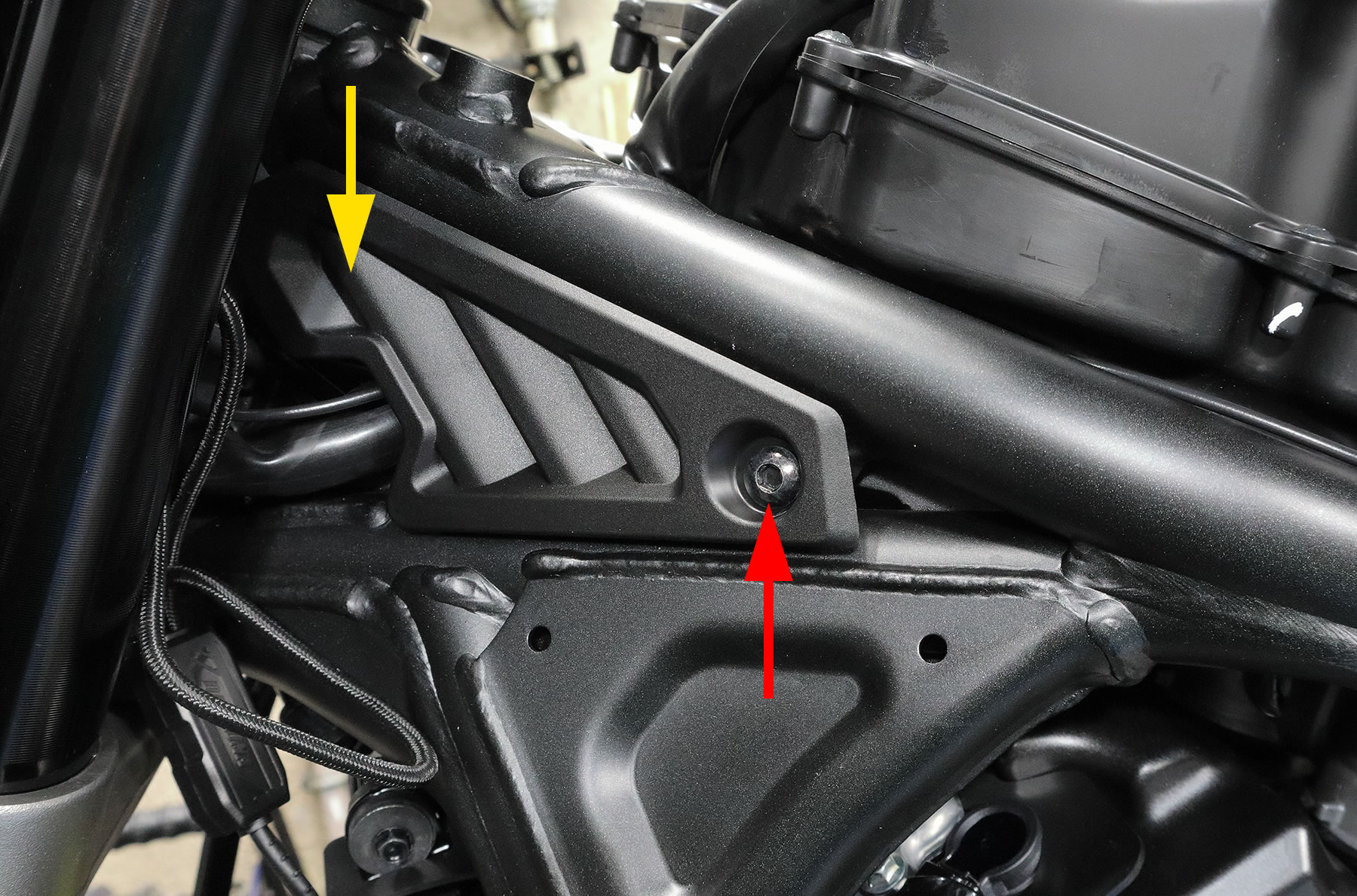 次はUSB電源の電源ケーブルを バッテリーの所まで通します。 まずは、ここのカバーを外すので 六角穴のボタンボルトを外します。 あとは黄矢印の所にグロメットに刺して固定してあるので 手前に引っ張って外します。 |