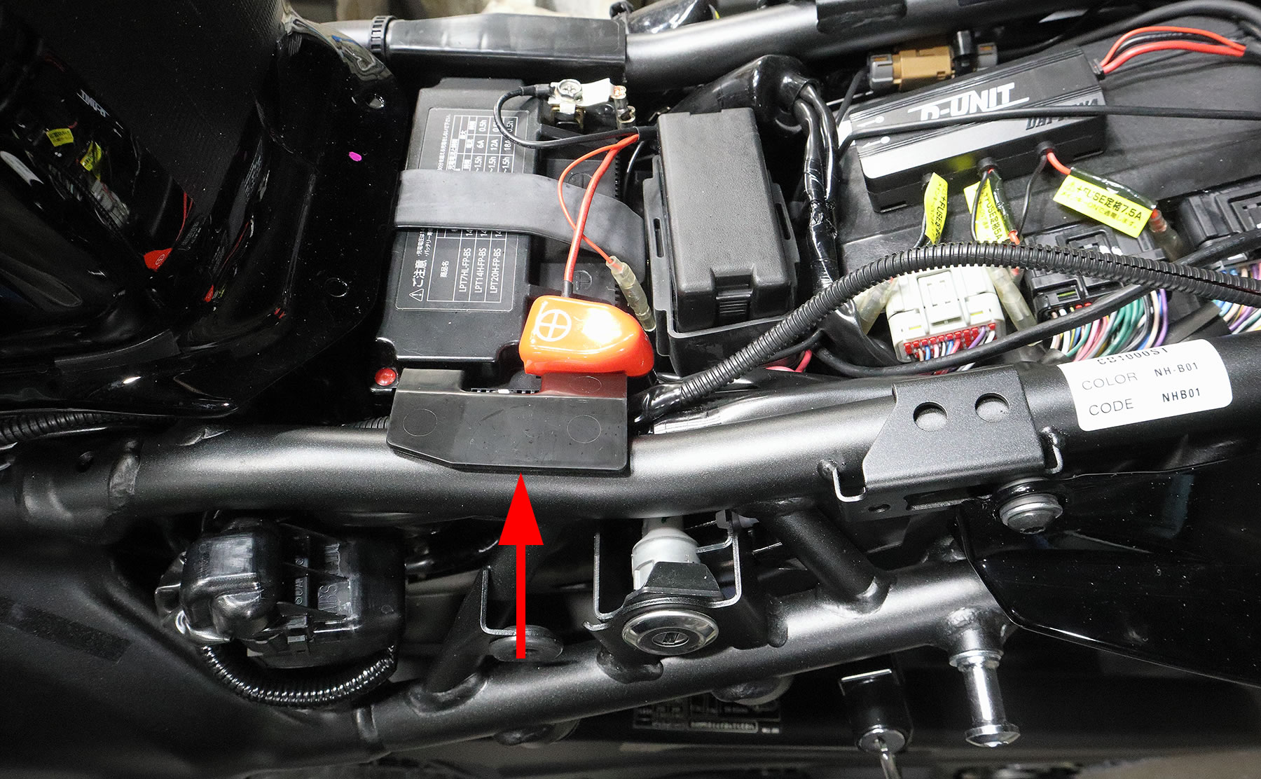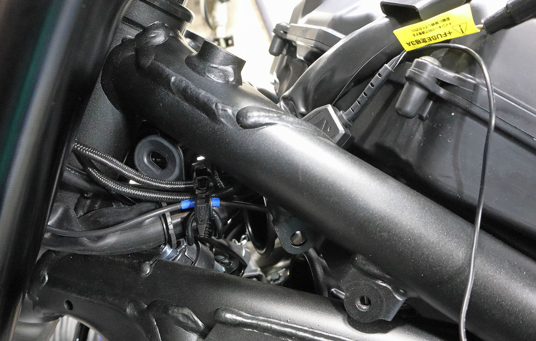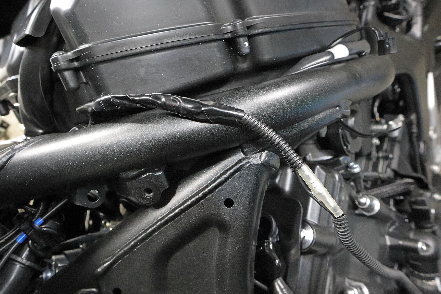 すると、こんな感じになりますが フレームの内側から上に通し エアクリーナーボックス横から後方に USB電源のケーブルを通していきます。 |