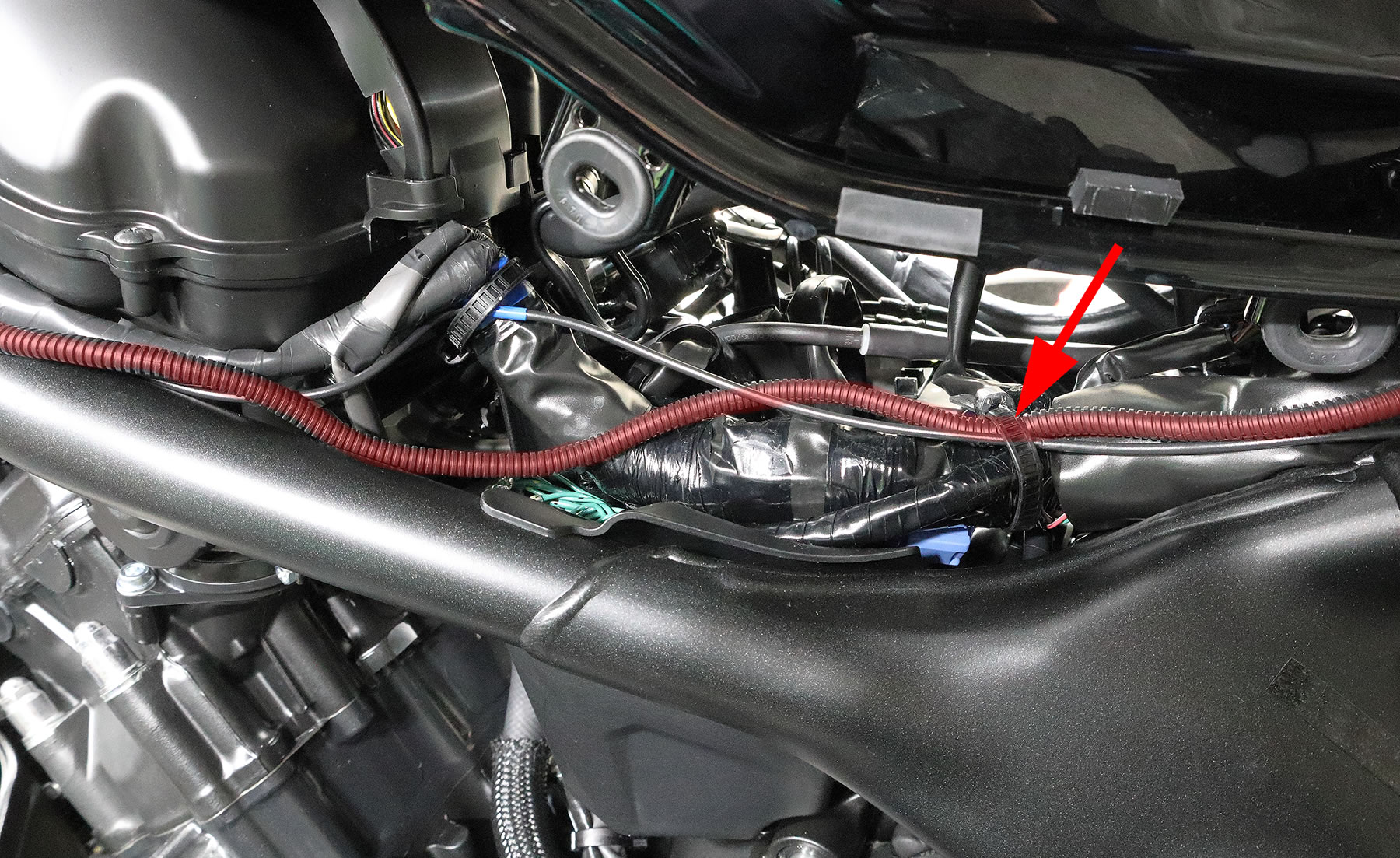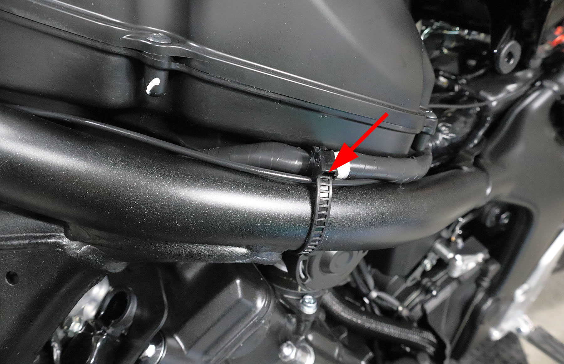 エアクリーナーボックス横にもリピートタイがあるので 一旦外してからケーブルを通し元に戻します。 |