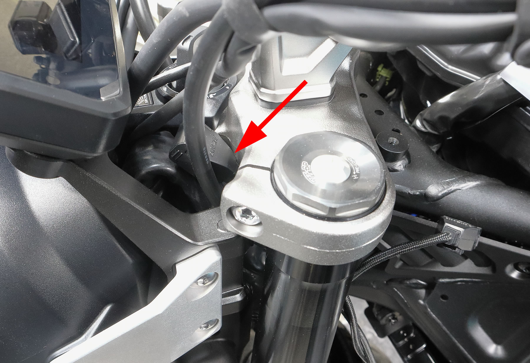 次はUSBソケット部分を車体左側から トップブリッジの下を通し 隙間からハンドルバーまで持っていきます。 |