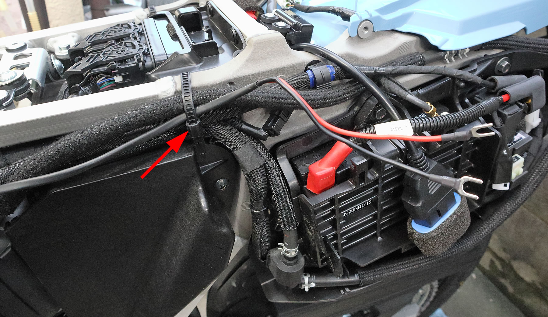 元々車体にあるリピートタイをほどいて その中にケーブルを通すと見た目も奇麗に収まります。 |
