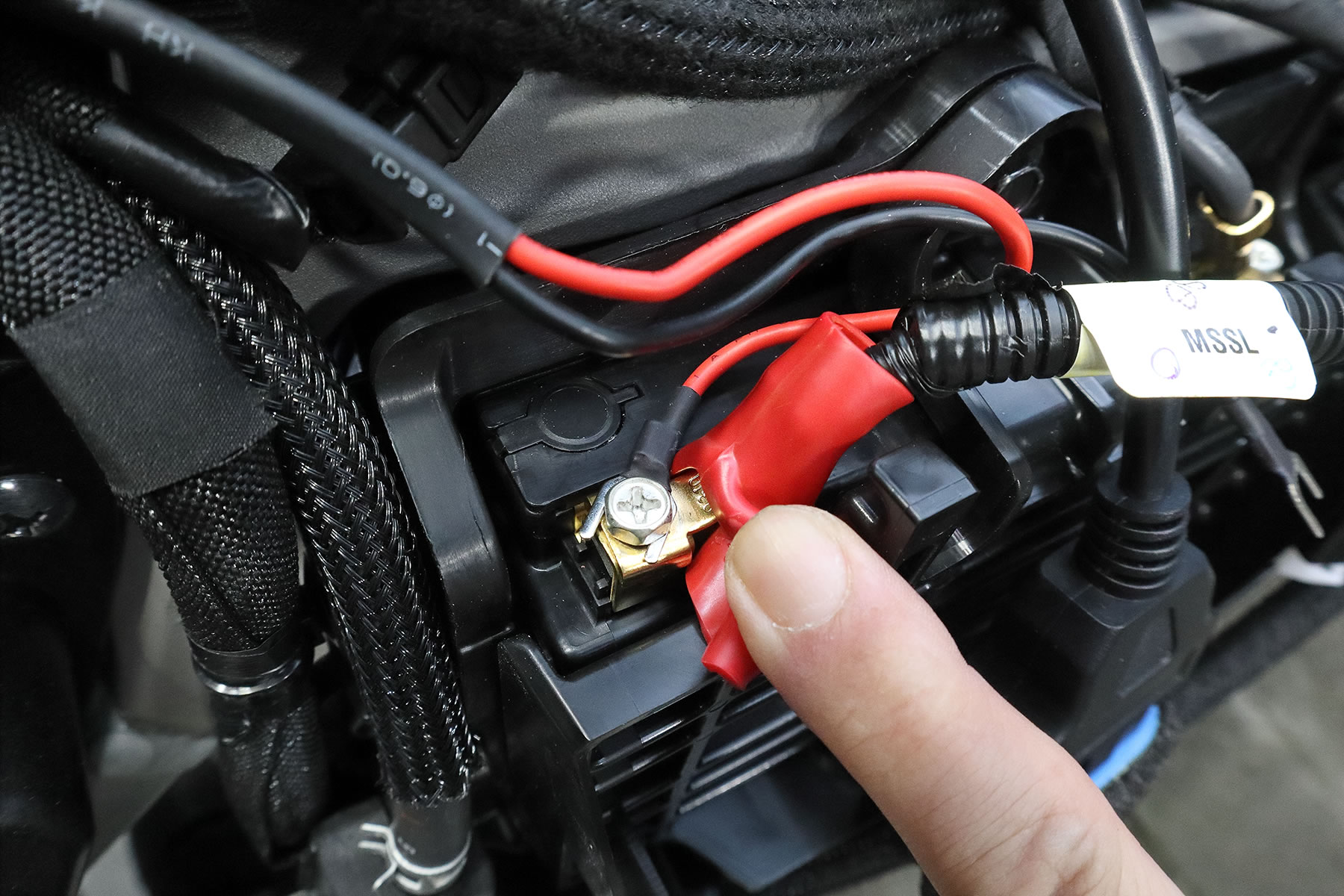 赤ケーブル側のY型端子を バッテリーのプラスのターミナルボルトに共締めし 黒のケーブル側をバッテリーのマイナスに共締めします。 |