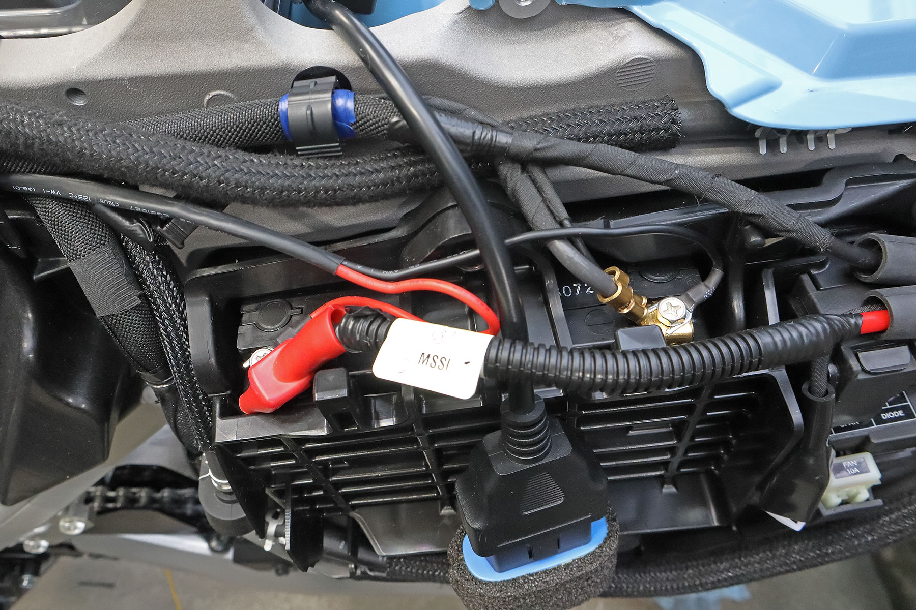 防水電源ユニットから伸びる 先端にY型端子が付いたプラスとマイナスのケーブルを バッテリーまで通します。 写真のような配線通しを使って反対側から ケーブルを迎えに行くと 手が入らないフレームの裏でも簡単に通せますよ。 ケーブルを通す場所は基本的に エンジンの熱い部分に触れないようにする事と 角が鋭い金属に触れないようにする事と 外からは見えない所を通します。 |