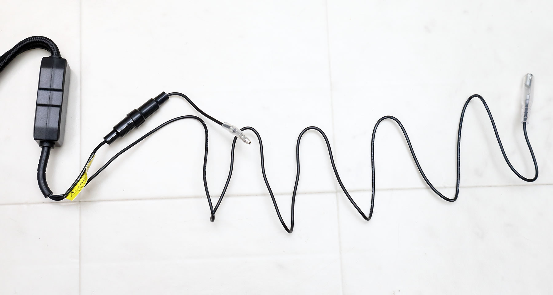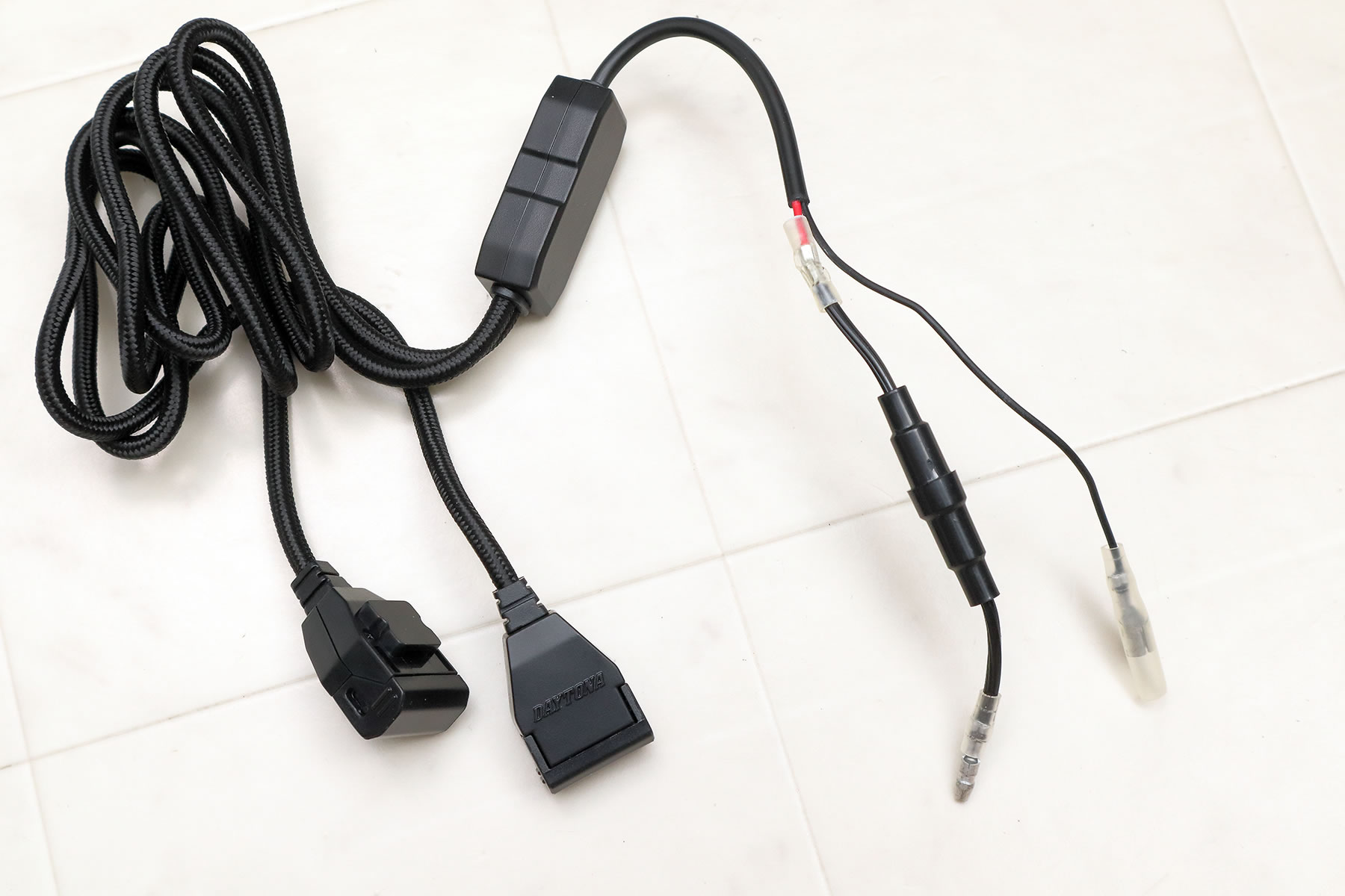 まずはUSB電源の仕様ですが 電源に接続するケーブル部分は 最初からギボシ端子が付いているので デイトナの電源ユニットにダイレクトに接続出来ます。 ヒューズが付いているプラス側のケーブルは短いので 本来なら付属の延長ケーブルを着けるのが前提なのですが 今回は、この短さで丁度良い長さになるので 逆にマイナス側が長すぎる事になります。 ちなみに・・購入時にミニヒューズケースのネジが 緩んでいる時があるので 事前に少し手で締めて確認しておきます。 |