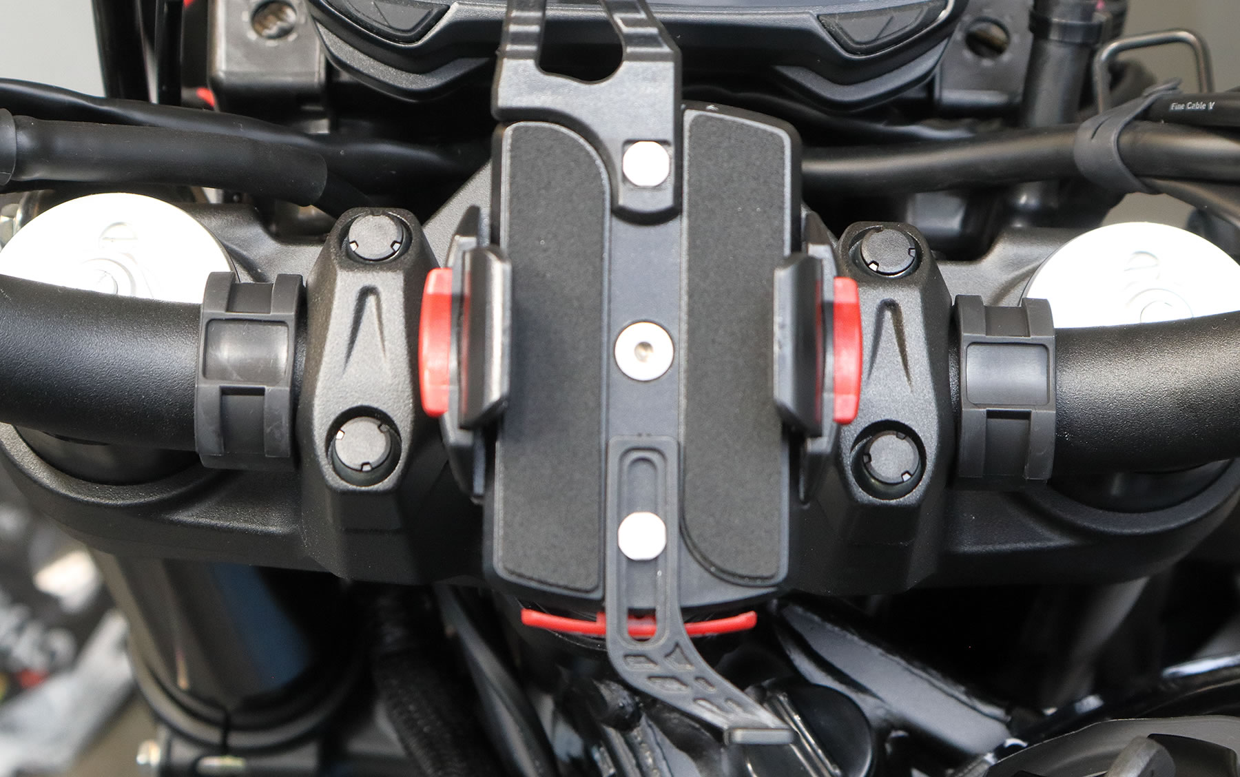 とりあえず先に車体にスマホを固定する為に ハンドルバーのセンターには 22.2mm~28.6mmのパイプまで対応している スマホホルダーを取り付けました。 ちなみにDR-Z4SやSMのようなオフロード車では ほとんどの車種で28.6mmのハンドルバーが採用されています。 |
