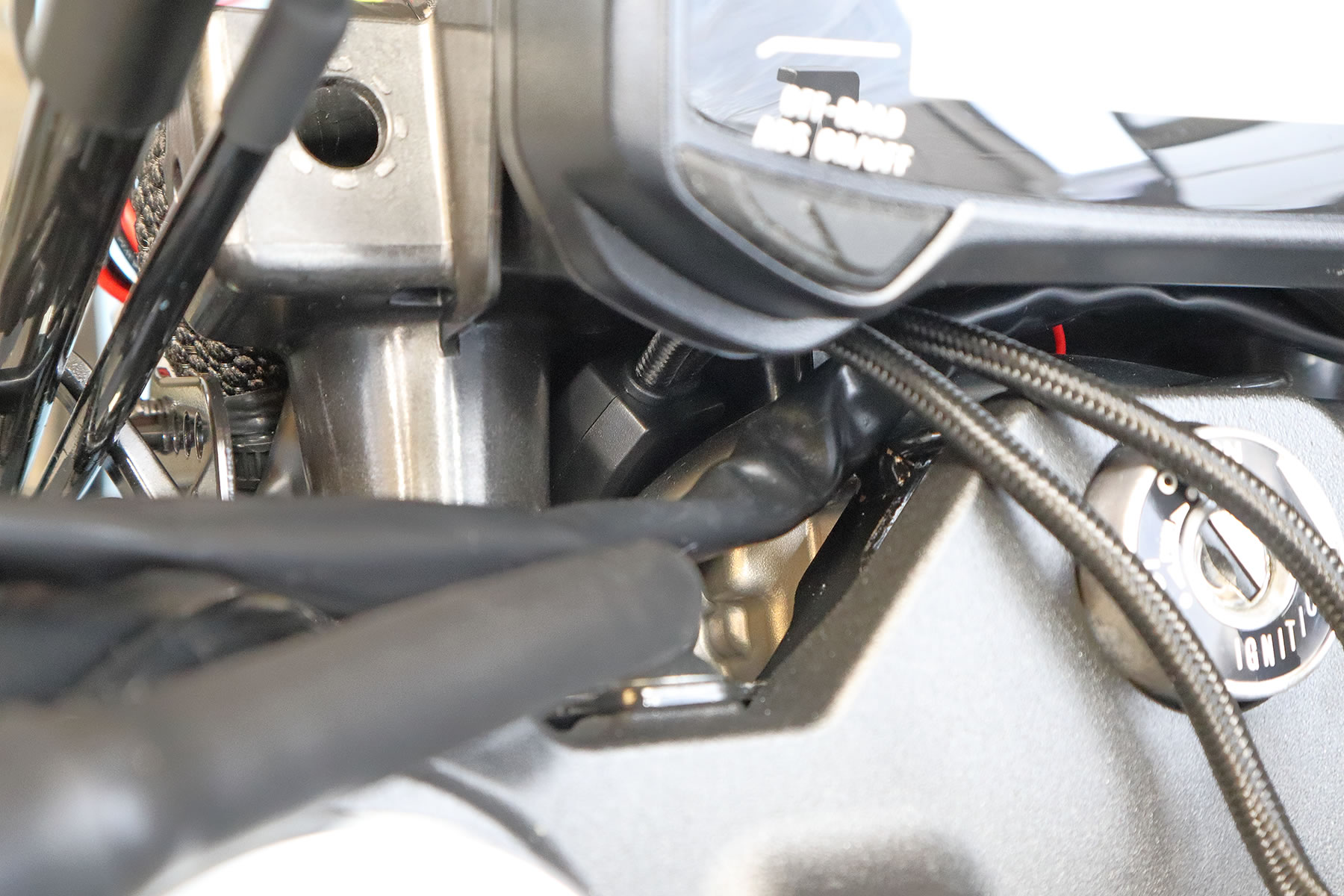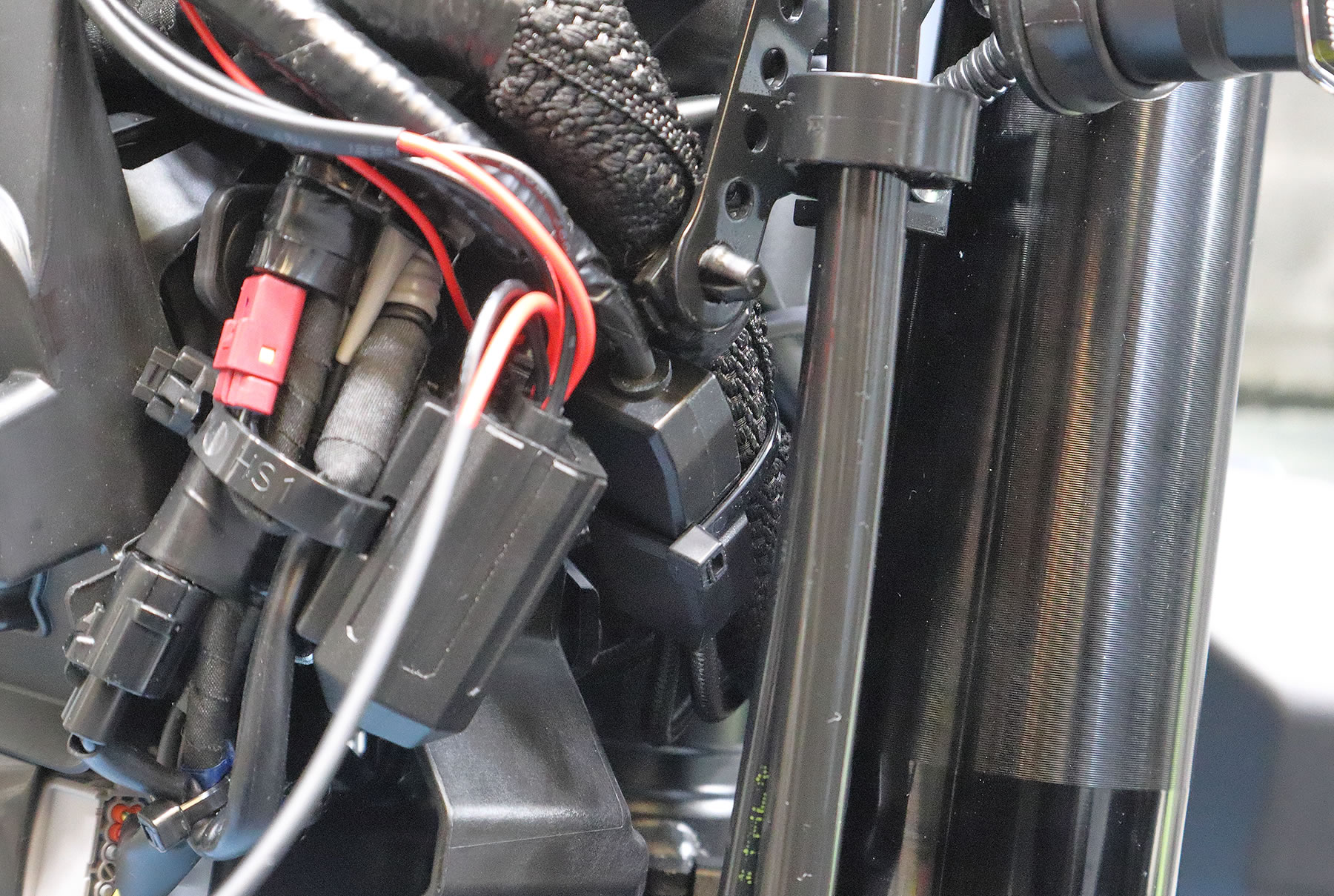次はヘッドライトまわりの所で USB電源のコントロールユニット部分を 付属の結束バンドを使って固定しますが ヘッドライトの左右にスペースがあるので 今回は左側にある太いケーブルに固定しました。 |