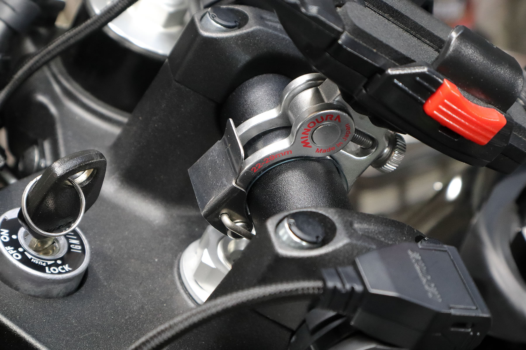 次は、UBS電源のソケット部分を車体に固定する為に 付属のリングをハンドルバーの好みの所に着けますが・・ 22.2mmのハンドルバー用のリングなので DR-Z4SMの28.6mmのハンドルバーだと 少し開き気味に変形してしまいます。 取付には特に問題はないのですが 経年劣化する事で樹脂に柔軟性が無くなってくると 無理をしている事でいずれは割れます。 |