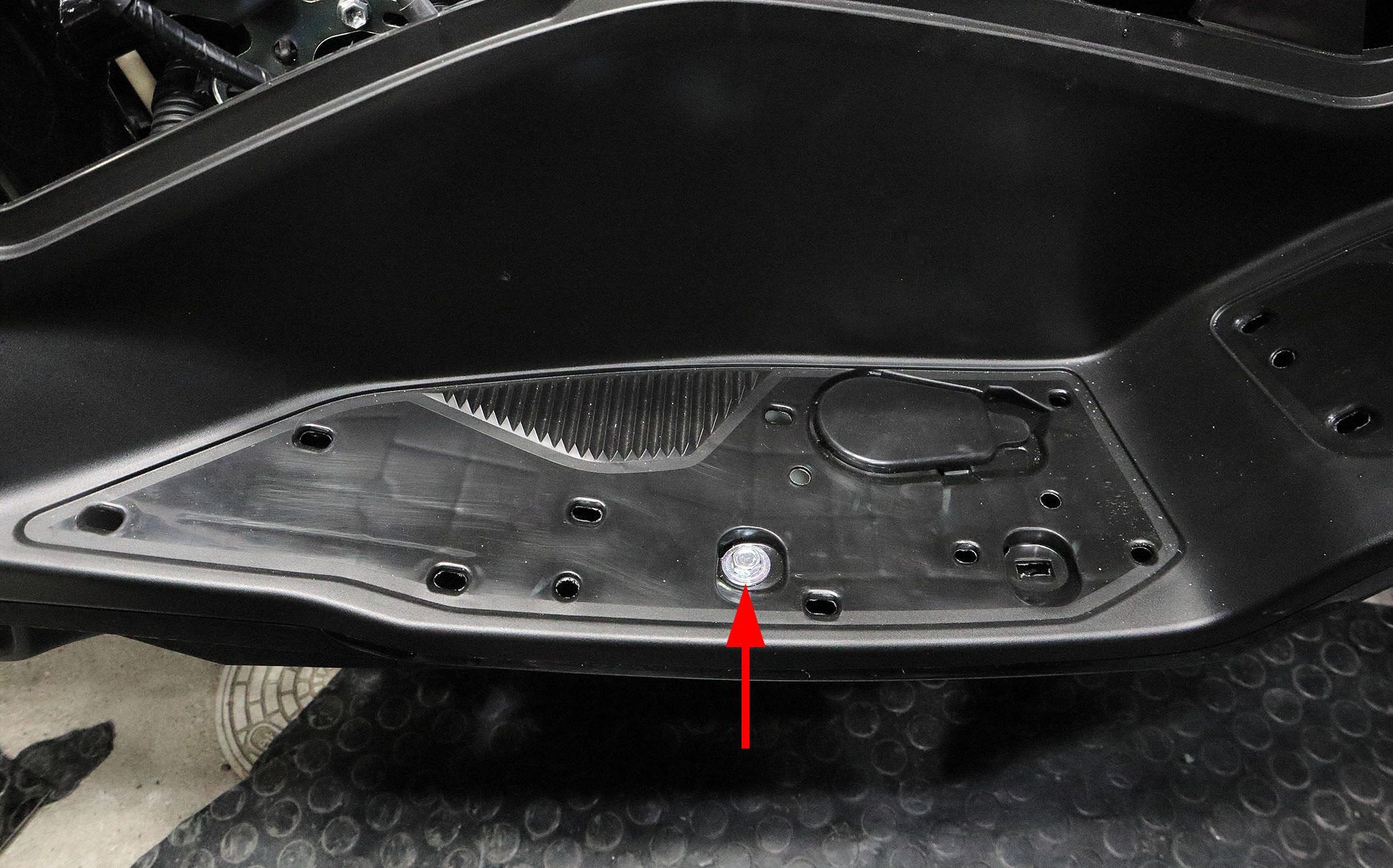 次はフットレストボードの後ろ側にある リアサイドカバーを連結している六角ボルトを外します。 |
