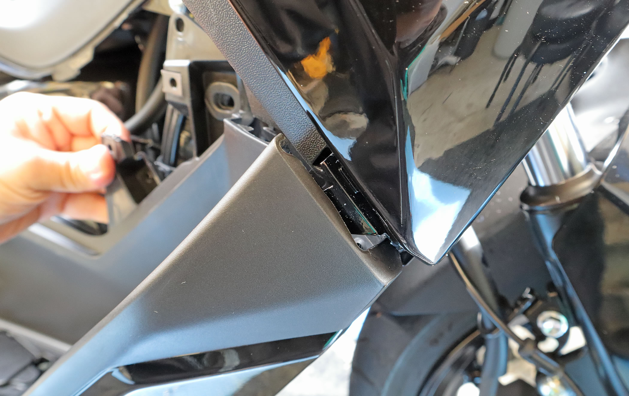 最後はフロントサイドカウリングに引っ掛けてあるツメを外せば フットレストボード全体が外れます。 |