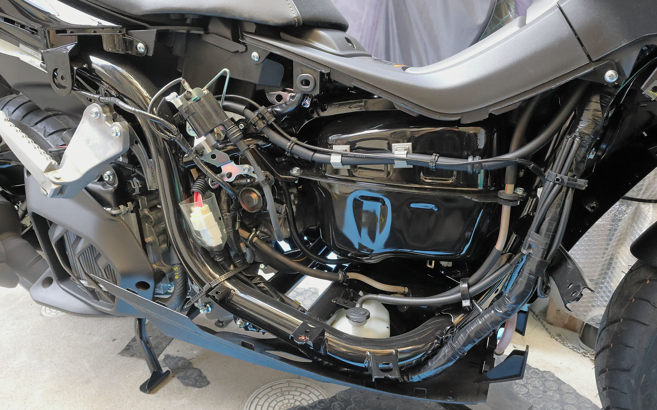 フロントサイドカバーとフットレストボードが外れると こんな感じになりますが 写真ではセンターロアカバーも外れています。 |